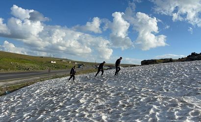 Sıcak havadan bunalanlar, Ardahan'daki karlı zirvelerde serinlemenin keyfini yaşıyor. Ziyaretçiler, yaylada hala karla kaplı noktalara çıkarak kar üstünde geziyor.
