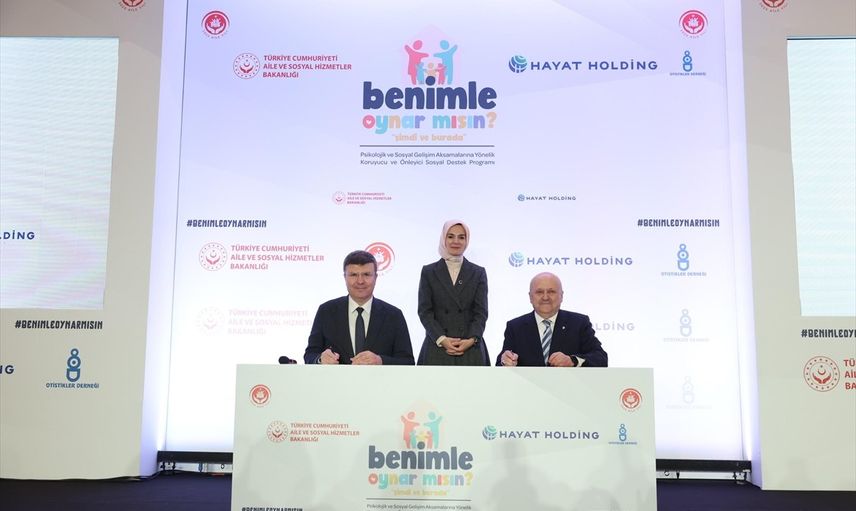 Aile ve Sosyal Hizmetler Bakanı Mahinur Özdemir Göktaş, gelişimsel aksaklık riski taşıyan 15-36 ay arası çocukların taramadan geçirilerek erken müdahale ile desteklenmesi amacıyla Aile ve Sosyal Hizmetler Bakanlığı ve Hayat Holdingin iş birliğinde, Otistikler Derneğinin uzmanlığıyla hayata geçirilen "Benimle Oynar Mısın?" projesinin imza törenine katılarak konuşma yaptı.