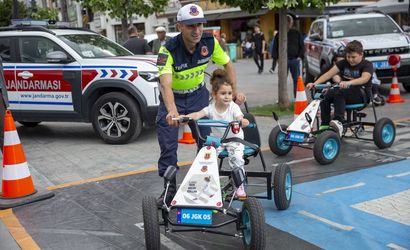 Kent Meydanı'nda yer alan tırlarda, katılımcılara trafik kuralları anlatıldı. Çocuklar, 3 tekerlekli bisikletlerle oluşturulan bir yolda jandarma personelinin rehberliğinde trafik deneyimi yaşadı. Burada, kırmızı ışık, yaya ve okul geçidi gibi kurallara uymanın önemi uygulamalı olarak gösterildi.