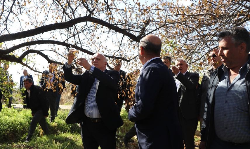 Türkiye Ziraat Odaları Birliği (TZOB) Genel Başkanı Şemsi Bayraktar (solda), Elazığ'ın Baskil ilçesinde zirai dondan etkilenen bahçelerde incelemede bulundu. Bayraktar, Velipalas köyü mevkisindeki kayısı bahçelerini gezdi, üreticilerden bilgi aldı.