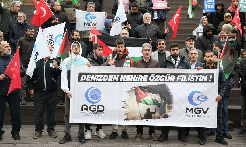 Eskişehir'de, Anadolu Gençlik Derneği Eskişehir Şubesi öncülüğünde Hamamyolu Yediler Parkı'nda İsrail'in Gazze'ye yönelik saldırılarına karşı protesto düzenlendi.