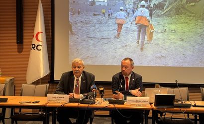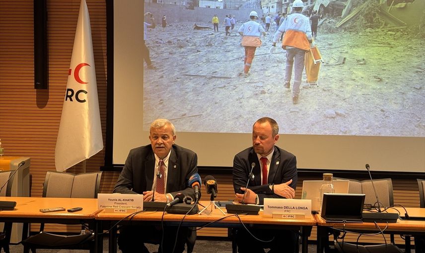 Filistin Kızılayı Başkanı Dr. Yunus el-Hatib (solda), Uluslararası Kızılhaç ve Kızılay Dernekleri Federasyonu (IFRC) Genel Merkezi'nde Birleşmiş Milletler (BM) Cenevre Ofisine Akredite Basın Mensupları Birliği (ACANU) üyesi gazetecilerle bir araya gelerek, İsrail'in yoğun saldırıları ve ablukası altındaki Gazze'de yaşananlara ilişkin değerlendirmelerde bulundu.