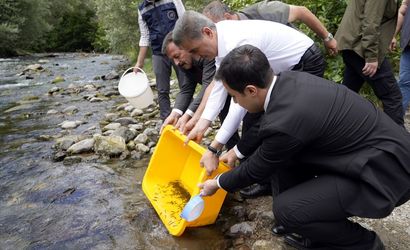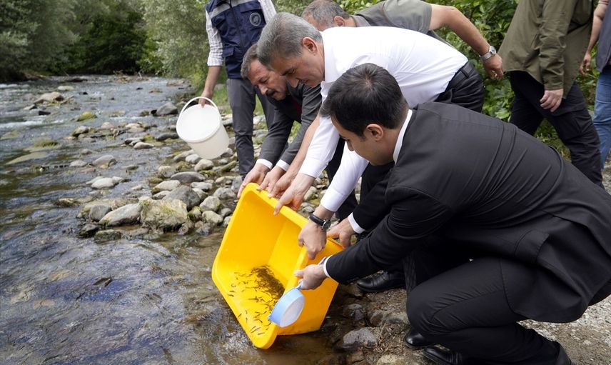 Gümüşhane'nin Torul ilçesindeki Çit Deresi'ne 10 bin kırmızı benekli alabalık yavrusu bırakıldı. Vali Aydın Baruş (sağ 2), etkinliğe katıldı.