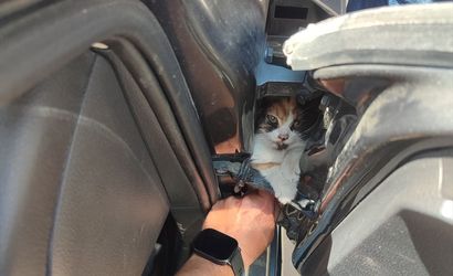Hatay'ın İskenderun ilçesinde otomobilin kapısına sıkışan kedi yavrusu itfaiye ekibince kurtarıldı.