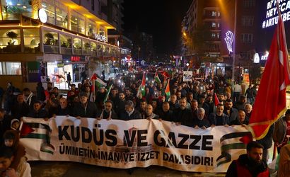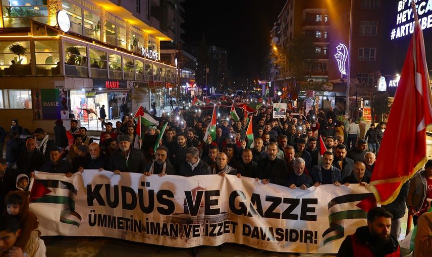 Grup, "Kudüs ve Gazze ümmetin iman ve izzet davasıdır" ile "Fırat'tan Gazze'ye direnişe bin selam" yazılı pankartlarla yürüyüşe geçti. Ellerinde Türkiye ve Filistin bayraklarıyla tekbir getiren kalabalık, İsrail aleyhine sloganlar atarak 15 Temmuz Demokrasi ve Şehitler Parkı'na kadar ilerledi.