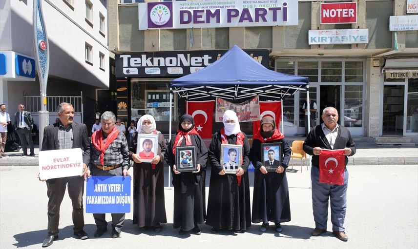 Muş’ta, çocukları terör örgütü PKK tarafından kaçırılan aileler, DEM Parti İl Başkanlığı önünde gerçekleştirdikleri eylemi sürdürüyor. Aileler, evlatlarına teslim olmaları için çağrıda bulunuyorlar.