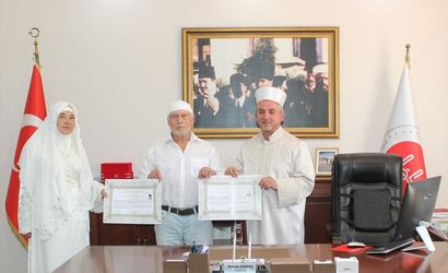 Müslümanlıklarını ilan eden çift, Kur'an-ı Kerim ve Diyanet İşleri Başkanlığı tarafından sağlanan Rusça eserlerden oluşan bir kitap seti ile onurlandırıldı.